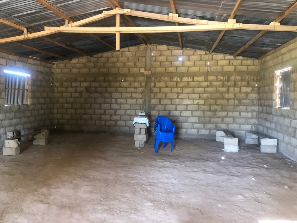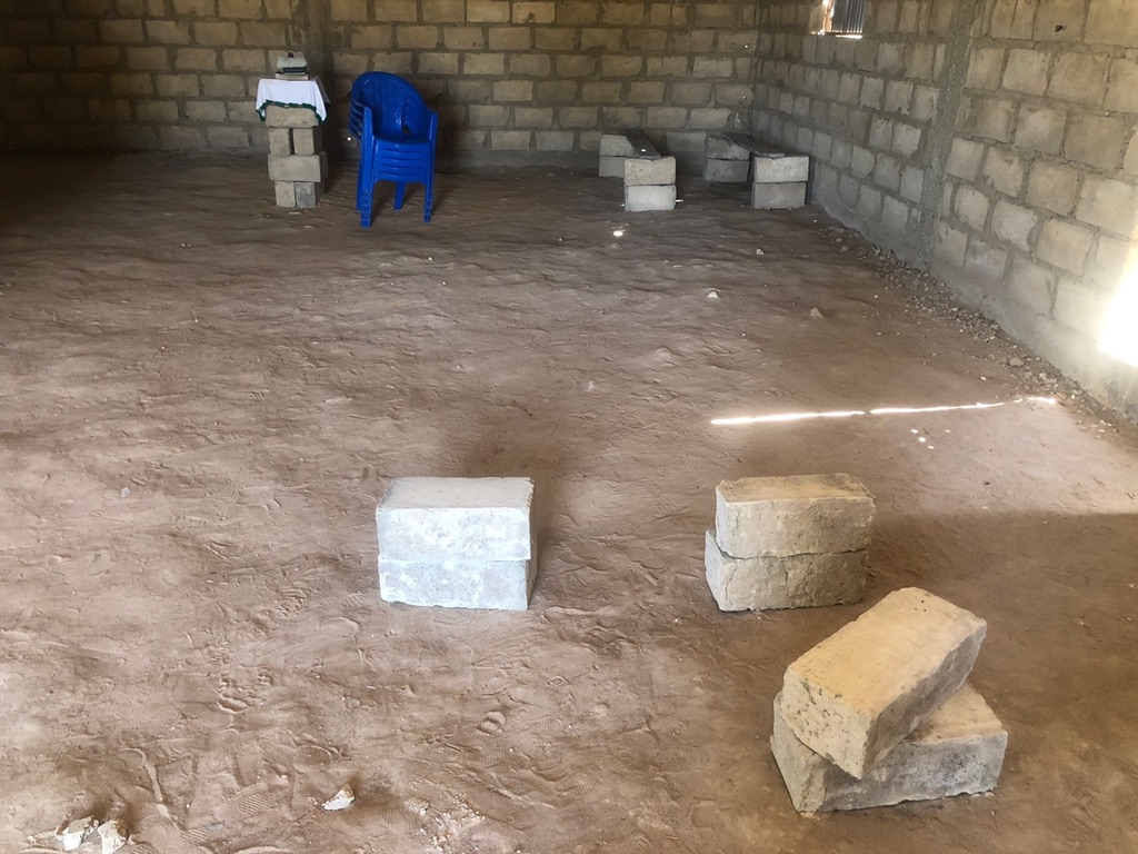 강단이 없어 벽돌을 세워 강단으로 사용하고 있고 의자가 몇개 없어 돌위에 앉아 예배드리는 상황입니다.